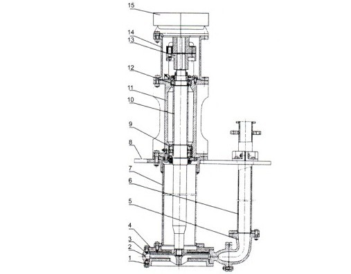 1、前蓋 2、泵體 3、葉輪 4、出水彎頭 5、排液管 7、聯(lián)接管 8、固定盤(pán) 9、軸承 10、軸 11、軸承體 12、軸承 13、聯(lián)軸器部件 14、電機(jī)架 15、電動(dòng)機(jī)