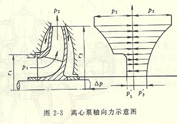 液體以低壓進(jìn)入葉輪,而在高壓下流出葉輪,也就是說,葉輪人口處液體的壓力較低,葉輪背側(cè)的壓力較高,而且由于葉輪前后蓋板形狀的不對(duì)稱,使得葉輪兩側(cè)受到的液體壓力不相等,因而產(chǎn)生了軸向推力,如圖2-3所示。這個(gè)軸向推力作用在葉輪上,通過葉輪螺母?jìng)鬟f到整個(gè)轉(zhuǎn)子上,使泵的整個(gè)轉(zhuǎn)子發(fā)生向葉輪吸人口方向的竄動(dòng),引起泵的振動(dòng),軸承發(fā)熱,甚至損壞零件。為避免軸向推力的不良影響,圖2 2所示