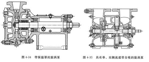 ①保溫旋渦泵 某些化學工業(yè)用泵,對輸送液體要求保持一定的溫度。否則液體可能揮發(fā)、結(jié)晶、凝結(jié)或產(chǎn)生化學變化。因此,通常是在泵過流部件的外圍加保溫罩,在其間通過具有一定溫度的液體,以達到保溫的目的。圖4—3 4所示為帶保溫罩旋渦泵的結(jié)構(gòu)。