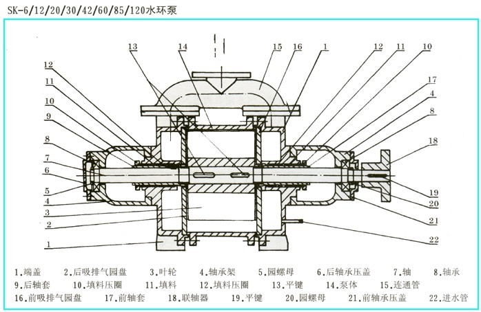 水環(huán)泵的泵體、兩個(gè)端蓋、葉輪、軸等部件級(jí)成。進(jìn)氣管和排氣管通過安裝在端蓋上的園盤上的吸氣孔和排氣孔與泵腔相連,軸偏心地安裝在泵體中,葉輪用平鍵固定在軸上。泵兩端面的總間隙由泵體和園盤之間的墊來(lái)調(diào)整,葉輪與端蓋上的園盤之間的間隙由軸套(SK-1.5/3/6)或背帽(SK-12/20/30)推動(dòng)葉輪來(lái)調(diào)整,而SK-42以上軸與葉輪為過盈配合,此間隙由前端定位時(shí)確定,SK-42/60/85/120無(wú)軸套,其余結(jié)構(gòu)與SK-6/12/30相同。葉輪兩端面與端蓋園盤的間隙決定氣休在泵腔內(nèi)由進(jìn)氣口至排氣口流動(dòng)中損失的大小及其極限壓力。