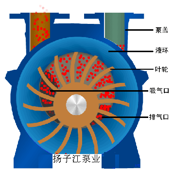如圖:在泵體中裝有適量的水作為工作液。當(dāng)葉輪按圖中順時針方向旋轉(zhuǎn)時,水被葉輪拋向四周,由于離心力的作用,水形成了一個決定于泵腔形狀的近似于等厚度的封閉圓環(huán)。水環(huán)的下部分內(nèi)表面恰好與葉輪輪轂相切,水環(huán)的上部內(nèi)表面剛好與葉片頂端接觸(實際上葉片在水環(huán)內(nèi)有一定的插入深度)。此時葉輪輪轂與水環(huán)內(nèi)界面之間形成一個月牙形空間,而這一空間又被葉輪葉片分成和葉片數(shù)目相等的若干個小腔。如果以葉輪的下部0°為起點,那么葉輪在旋轉(zhuǎn)前180°時小腔的容積由小變大,且與端面上的吸氣口相通,此時氣體被吸入,當(dāng)吸氣終了時小腔則與吸氣口隔絕;當(dāng)葉輪繼續(xù)旋轉(zhuǎn)時,小腔由大變小,使氣體被壓縮;當(dāng)小腔與排氣口相通時,氣體便被排出泵外。