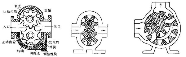 泵殼中有一對嚙合的齒輪,其中一個是主動齒輪,另一個是從動齒輪,由主動齒輪嚙合帶動旋轉。齒輪于泵殼、齒輪與齒輪之間留有較小的間隙,當齒輪沿圖示箭頭所指方向旋轉時,在輪齒逐漸脫離嚙合的左側吸液腔中,齒間密閉容積增大,形成局部真空液體在壓差作用下吸入吸液室,隨著齒輪旋轉,液體分兩路在齒輪與泵殼之間被齒輪推動前進,送到右側排液腔,在排液腔中兩齒逐漸嚙合容積減小,齒輪間的液體被擠到排液口。