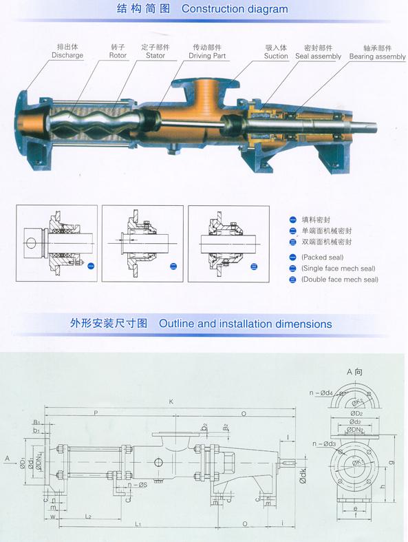 G型單螺桿泵是按迥轉(zhuǎn)嚙合容積式原理工作的新型泵種,主要工作部件是偏心螺桿(轉(zhuǎn)子)和固定的襯套(定子)。由于該二部件的特殊幾何形狀,分別形成單獨(dú)的密封容腔,介質(zhì)由軸向均勻推行流動,內(nèi)部流速低,容積保持不變,壓力穩(wěn)定,因而不會產(chǎn)生渦流和攪動。每級泵的輸出壓力為0.6Mpa,揚(yáng)程60m(清水),自吸高度一般在6m,適用于輸送介質(zhì)溫度80℃以下(特殊要求可達(dá)150℃)。因定子選用多種彈性材料制成,所以這種泵對高粘度流體的輸送和含有硬質(zhì)懸浮顆粒介質(zhì)或含有纖維介質(zhì)的輸送,有一般泵種所不能勝任的特點。其流量與轉(zhuǎn)速成正比。傳動可采用聯(lián)軸器直接傳動,或采用調(diào)速電機(jī),三角帶,變速箱等裝置變速。這種泵零件少,結(jié)構(gòu)緊湊,體積小,維修簡便,轉(zhuǎn)子和定子是本泵的易損件,結(jié)構(gòu)簡單,便于裝拆。