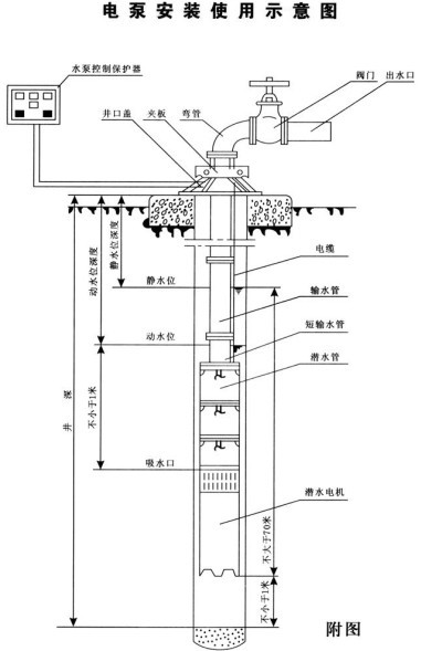 四、電動機必須完全潛入水中,但潛入深度應不大于70米。