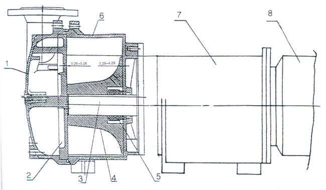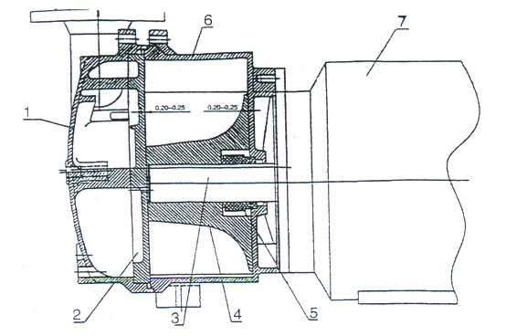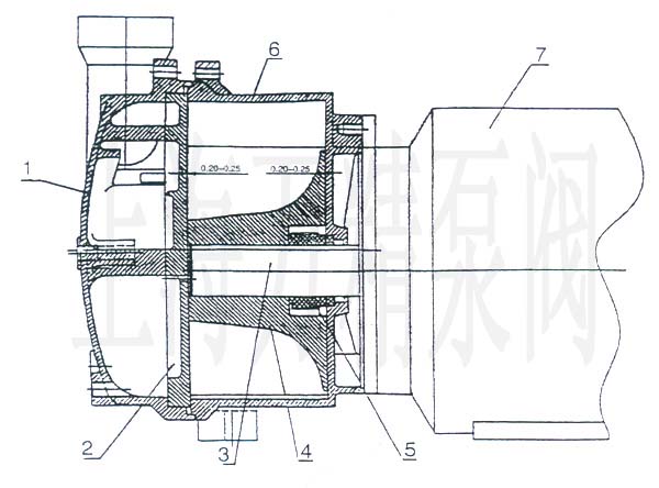 1.泵蓋 2.園盤 3.平鍵 4.葉輪 5.機(jī)械密封 6.泵體 7.電動(dòng)機(jī)