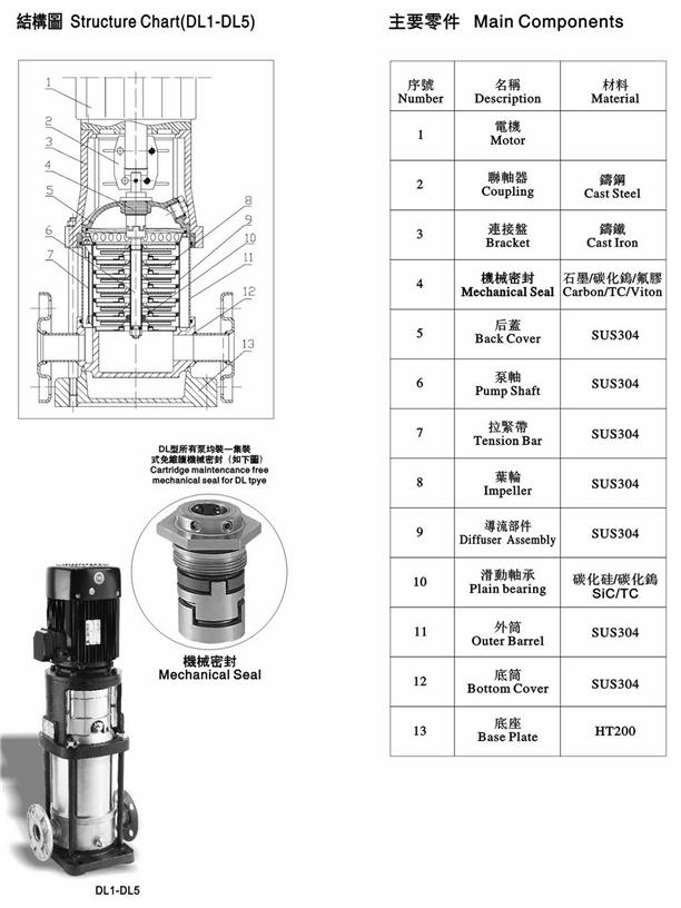 泵殼、葉輪、后蓋、泵軸及導(dǎo)流部件:SUS304或 SUS316L