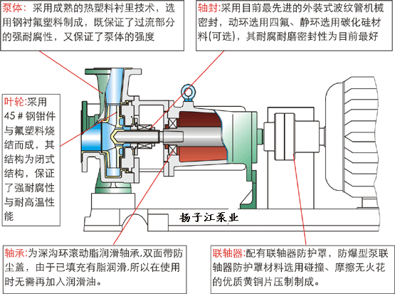 IHF單級單吸式氟塑料合金化工離心泵(簡稱IHF離心泵)是按國際標(biāo)準(zhǔn)并結(jié)合非金屬泵的工藝設(shè)計(jì)制造。泵體采用金屬外殼內(nèi)襯聚全氟乙丙烯(F46),泵蓋、葉輪和軸套均用金屬嵌件外包氟塑料整體燒結(jié)壓制而成,軸封采用外裝式先進(jìn)的波紋管機(jī)械密封,靜環(huán)選用99.9%氧化鋁陶瓷(或氮化硅),動環(huán)采用四氟填充材料,其耐腐耐磨密封性極好。泵的進(jìn)出口均采用鑄鋼體加固,以增強(qiáng)了泵的耐壓性。實(shí)際使用顯示,該泵具有耐腐、耐磨、耐高溫、不老化、機(jī)械強(qiáng)度高、運(yùn)轉(zhuǎn)平穩(wěn)、結(jié)構(gòu)先進(jìn)合理、密封性能嚴(yán)格可靠、拆卸檢修方便、使用壽命長等優(yōu)點(diǎn)安徽氟特泵業(yè)