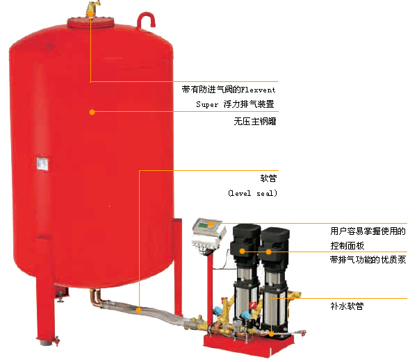 本定壓設(shè)備完全具備常用高位設(shè)置的膨脹水箱的三項基本功能;