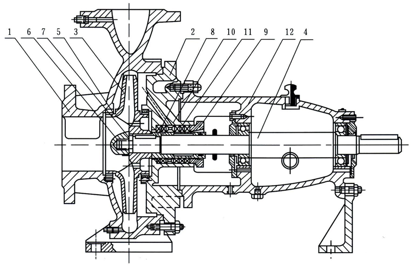1 泵體 2 泵蓋 3 葉輪 4 軸 5 密封環(huán) 6 葉輪螺母 7 止動墊圈 8 軸套 9 填料壓蓋 10 填料環(huán) 11 填料 12 懸架軸承部件