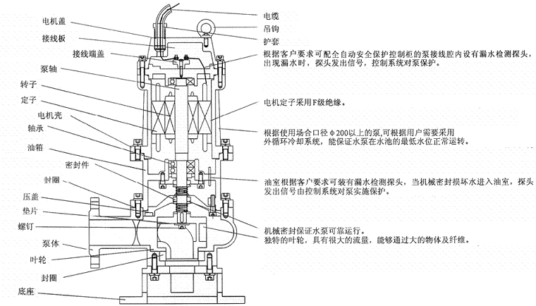 4.該泵密封油室內(nèi)設(shè)置有高精度抗干擾漏水檢測(cè)傳感器,定子繞組內(nèi)預(yù)埋了熱敏元件,對(duì)水泵電機(jī)自動(dòng)保護(hù)。