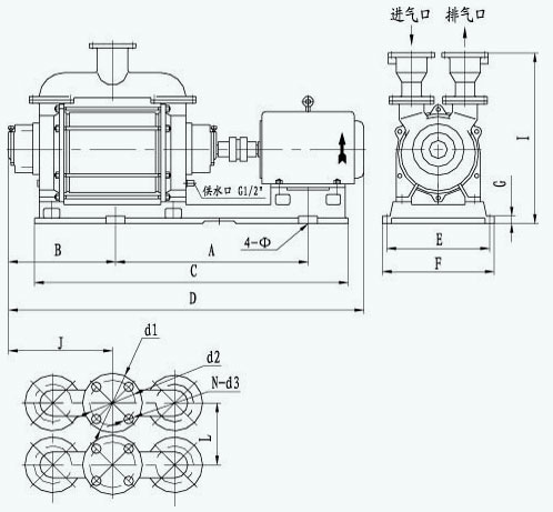 | 型號 | A | B | C | D | E | F | I | J | L | G | d1 | d2 | N-d3 | 4-Φ |